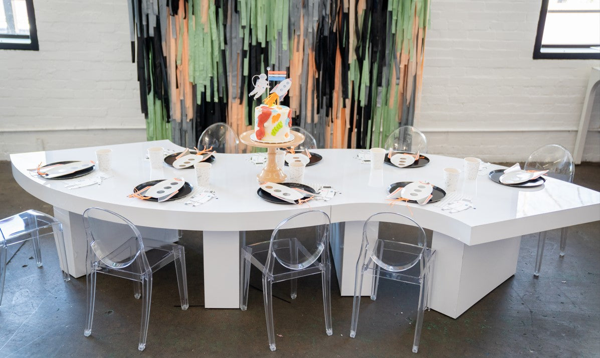 Squiggle your way into a fun-filled kid's party! Offering a welcoming environment for kids to socialize, sing happy birthday, and create unforgettable memories with our squiggly white kids table. 6ft table seats 12 kids chairs. Up to 6-hour rental, delivery & setup fees range from $65-$125 subject to taxes.