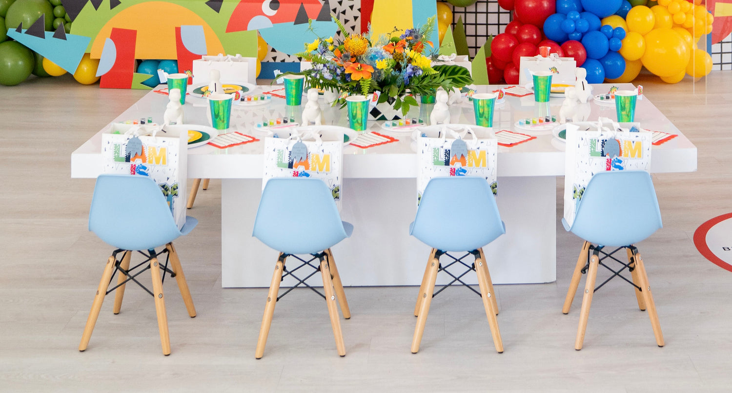 Surf's up with this pastel blue kid's table for birthday bashes! Enhance your child's birthday party with this charming pastel blue kid's table. Offering a welcoming environment for kids to mingle and create unforgettable memories. 6ft table seats 12 kids chairs. Up to 6-hour rental, delivery & setup fees range from $65-$125 subject to taxes.